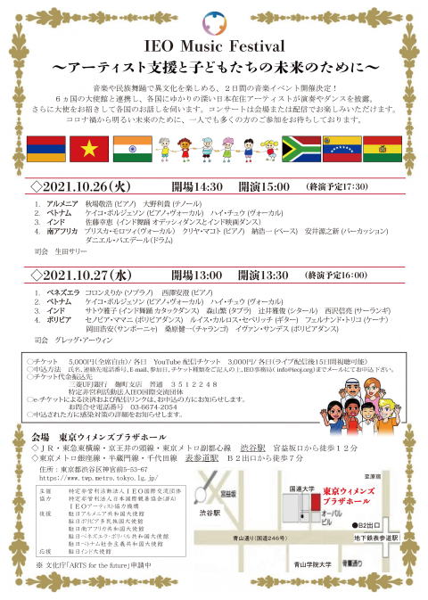 10月26日、27日両日、東京ウィメンズプラザホールで、アルメニア、ベトナム、インド、南アフリカ、ベネズエラ、ボリビアの大使・公使・アーティストをお招きして開催する、音楽や民族舞踊で異文化を楽しめる、2日間の音楽イベント。6ヵ国の大使館と連携し、各国にゆかりの深い日本在住アーティストが演奏やダンスを披露。 さらに各国の大使をお招きして各国のお話しを伺います。